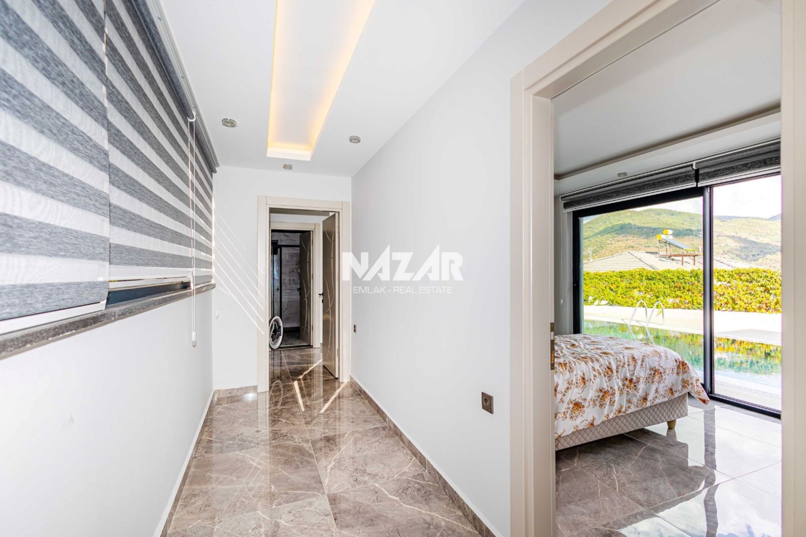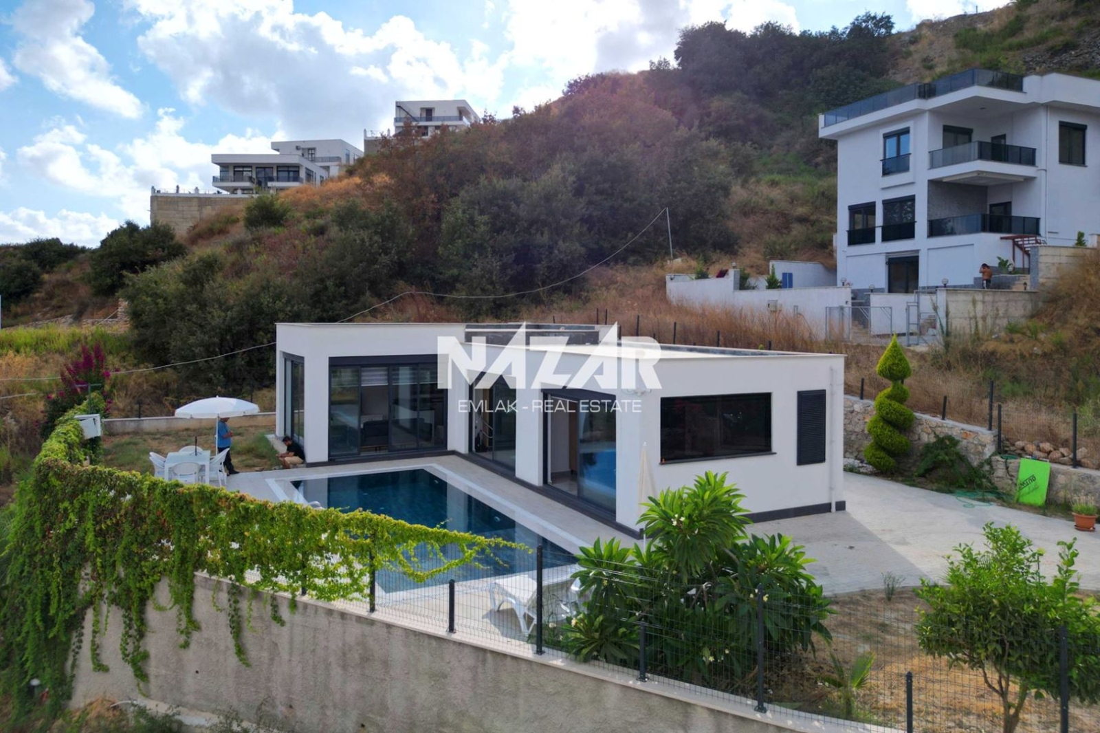 The villa includes a barbecue area, open-air parking, a private swimming pool, and a spacious garden. The building permit is for a two-storey structure; interested buyers may construct a second floor. This exclusive villa is available through Nazar Emlak.