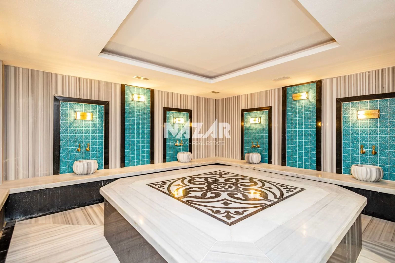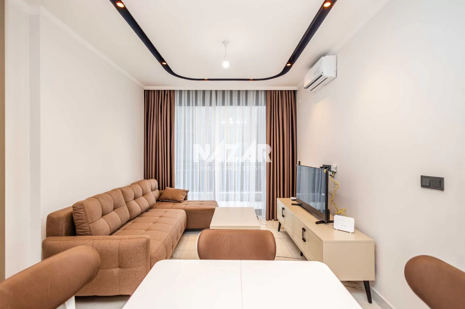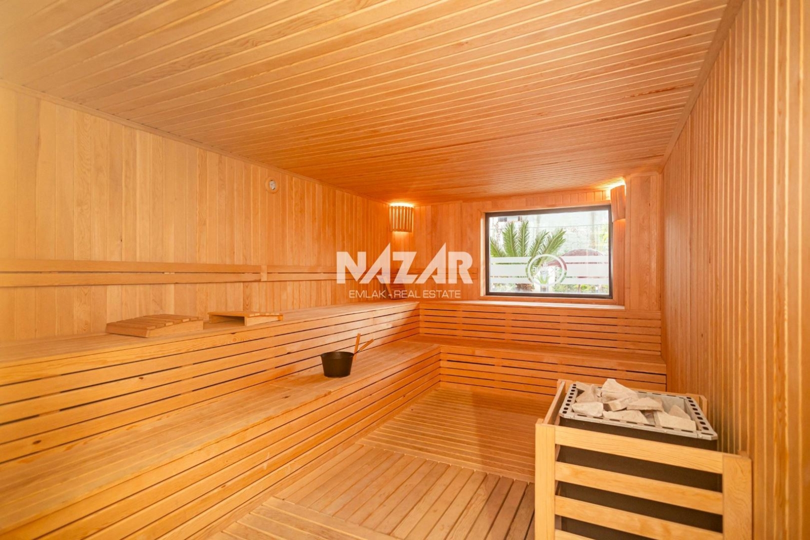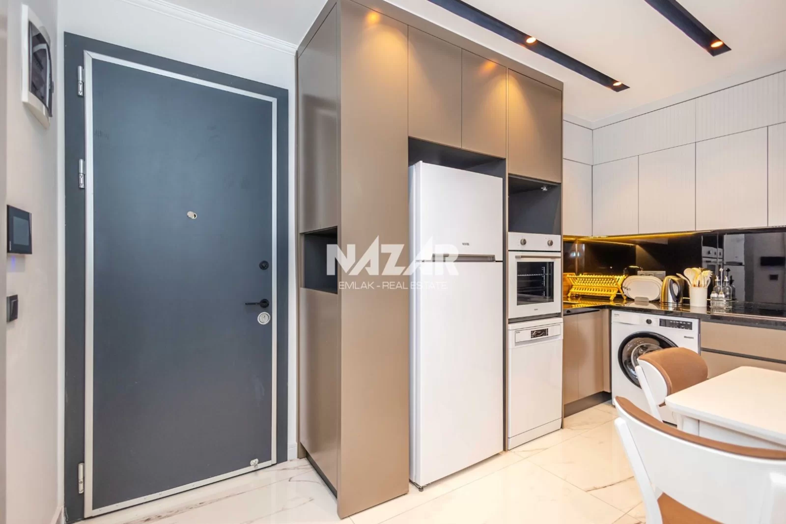 The site, designed with a 5-star hotel concept, offers amenities such as indoor and outdoor swimming pools, a fitness centre, sauna, steam and massage rooms, relaxation areas, a barbecue area, a children's play area, and a lobby. This rental apartment can be accessed through Nazar Emlak.