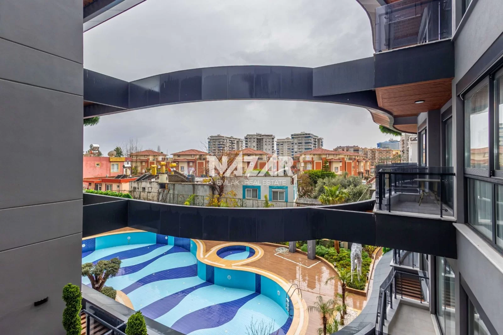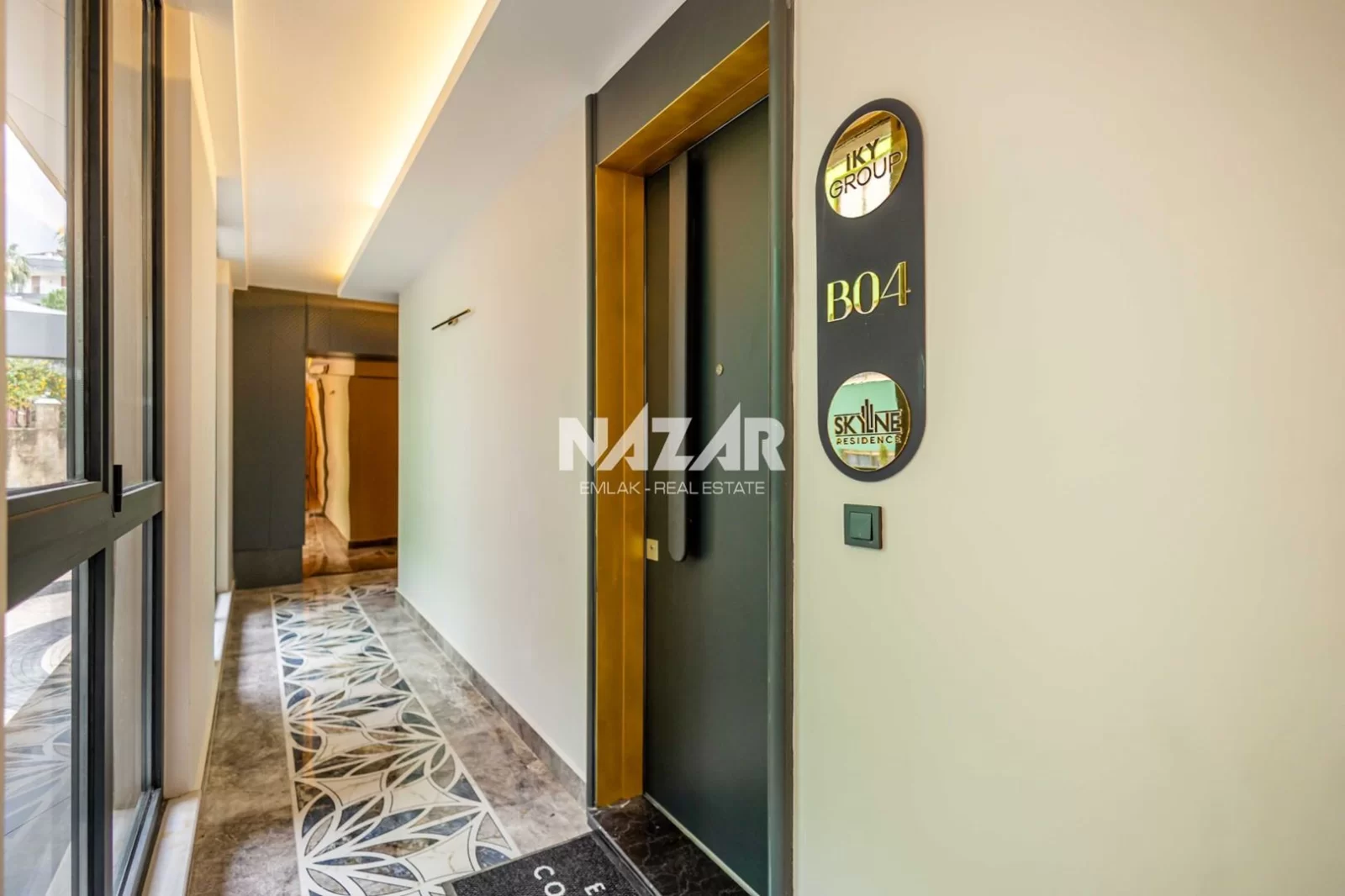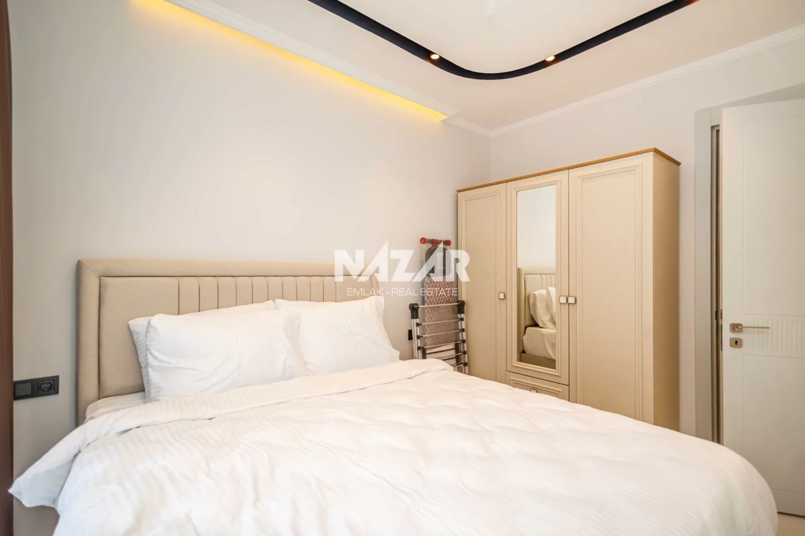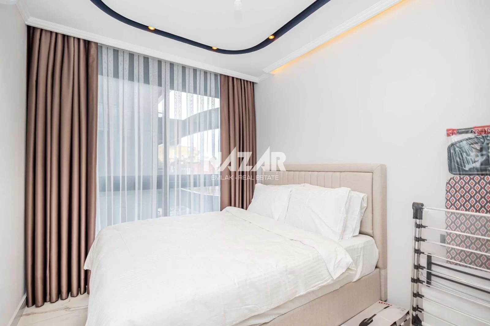 The site, designed with a 5-star hotel concept, offers amenities such as indoor and outdoor swimming pools, a fitness centre, sauna, steam and massage rooms, relaxation areas, a barbecue area, a children's play area, and a lobby. This rental apartment can be accessed through Nazar Emlak.