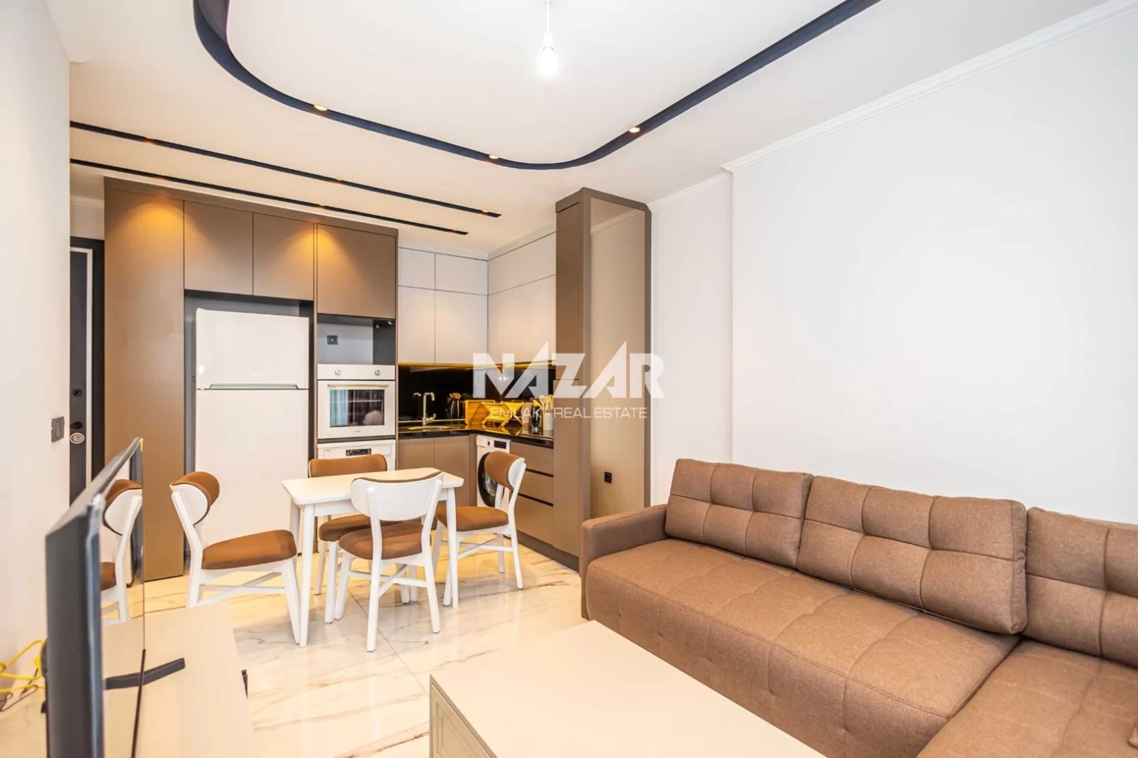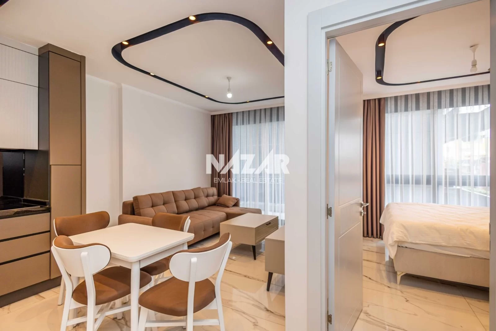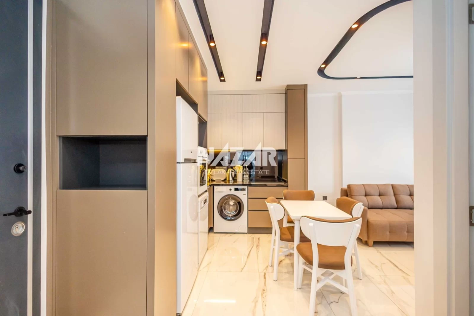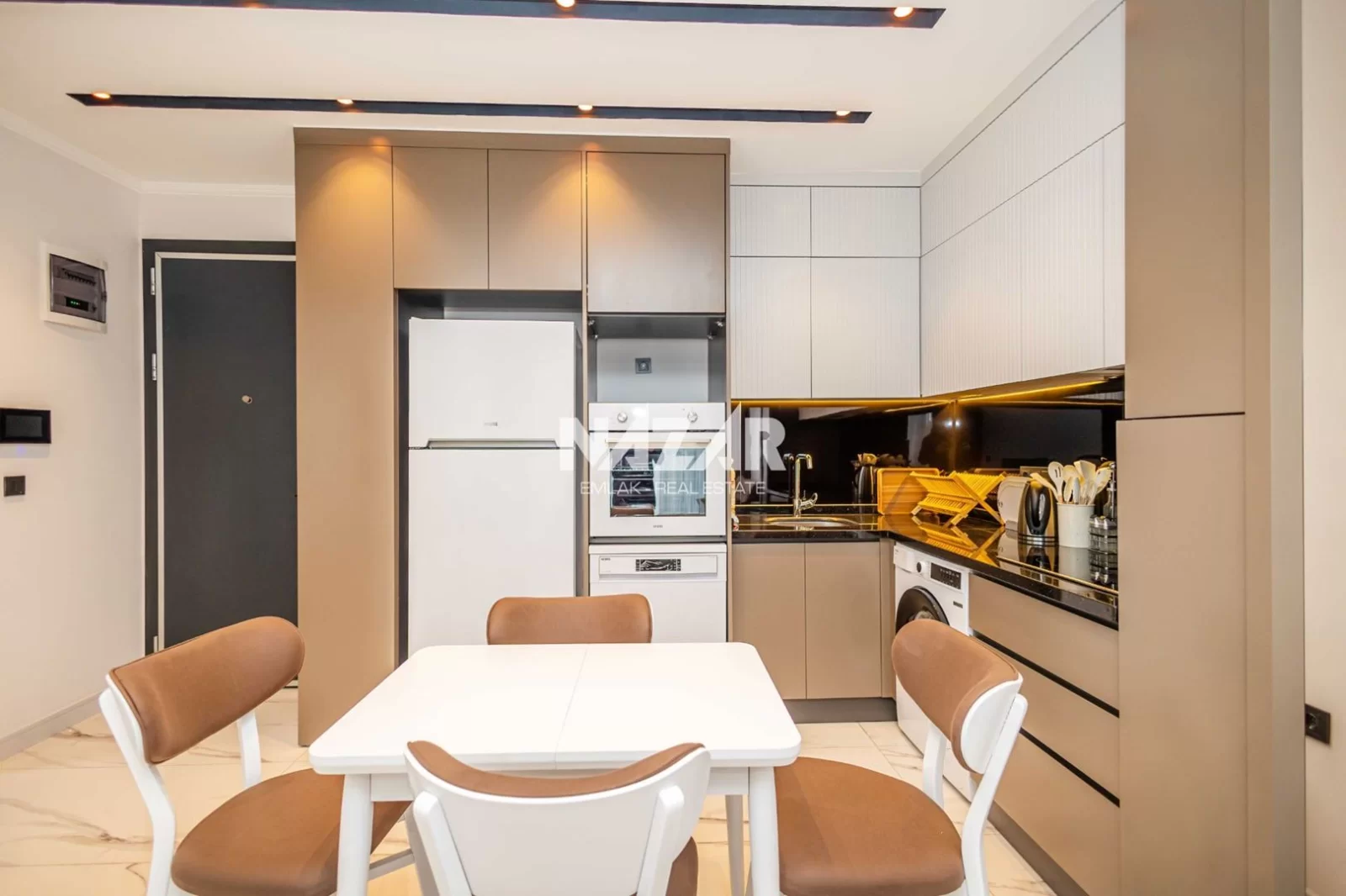 The site, designed with a 5-star hotel concept, offers amenities such as indoor and outdoor swimming pools, a fitness centre, sauna, steam and massage rooms, relaxation areas, a barbecue area, a children's play area, and a lobby. This rental apartment can be accessed through Nazar Emlak.