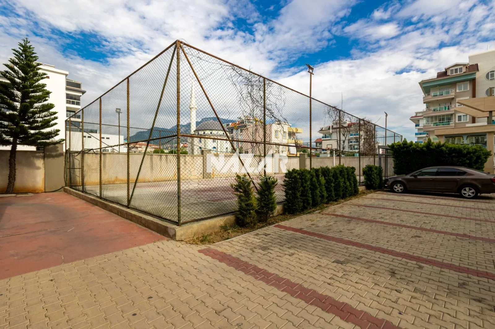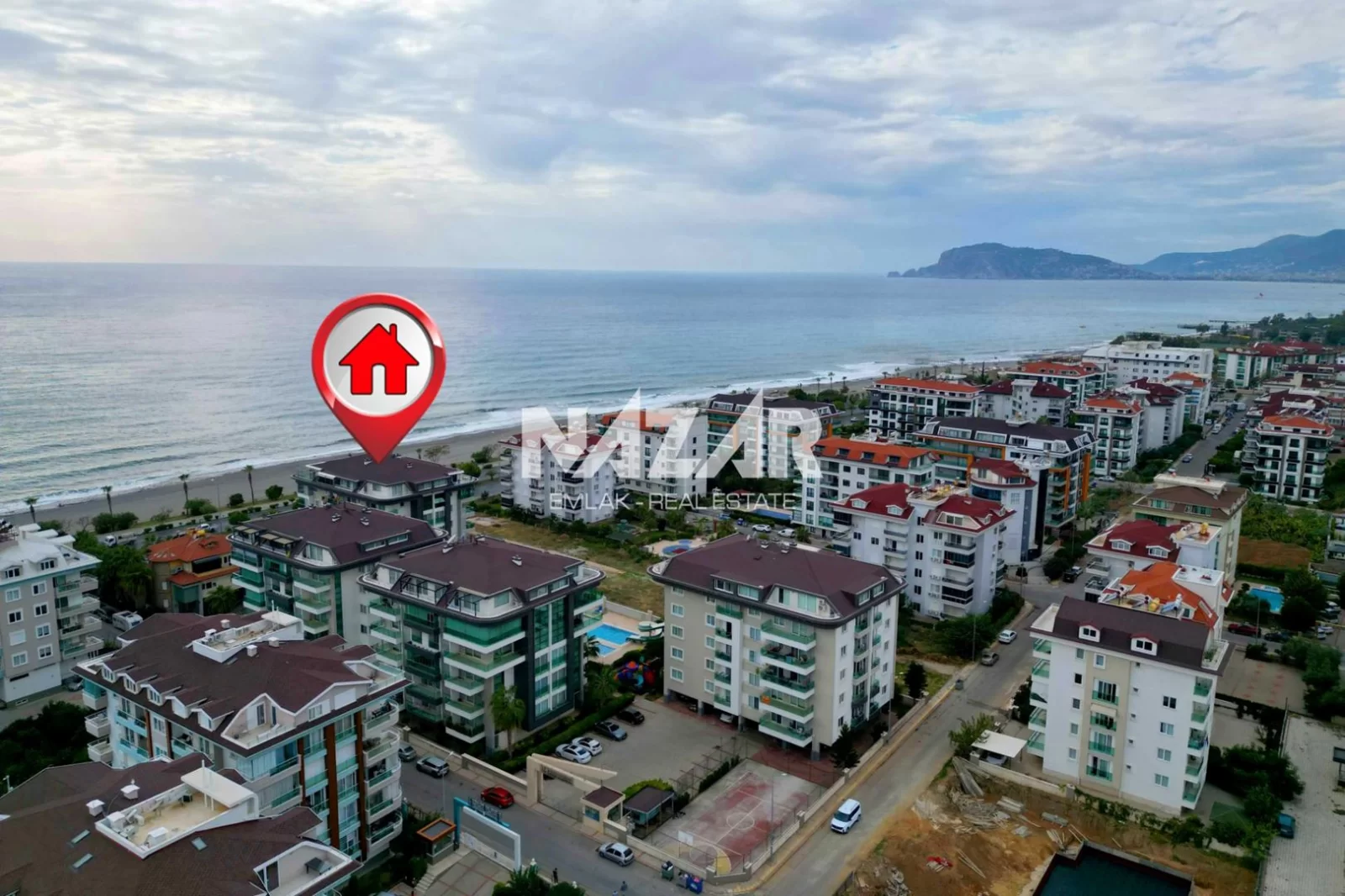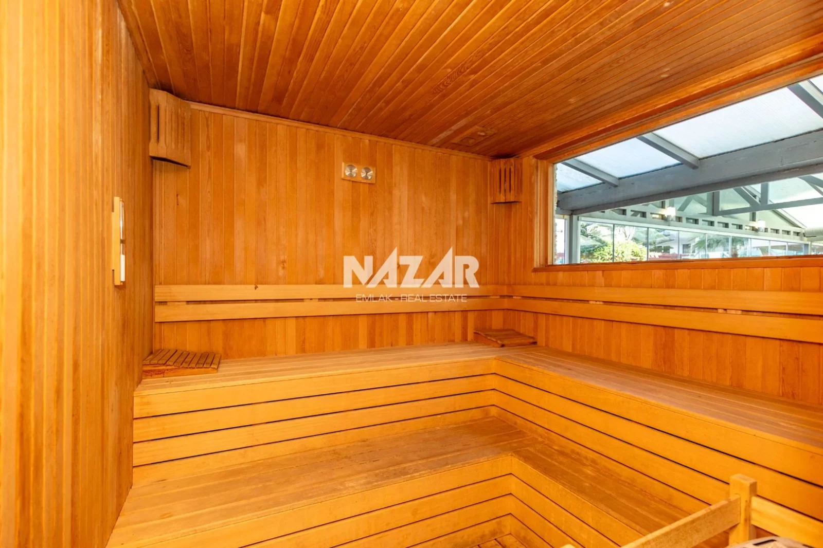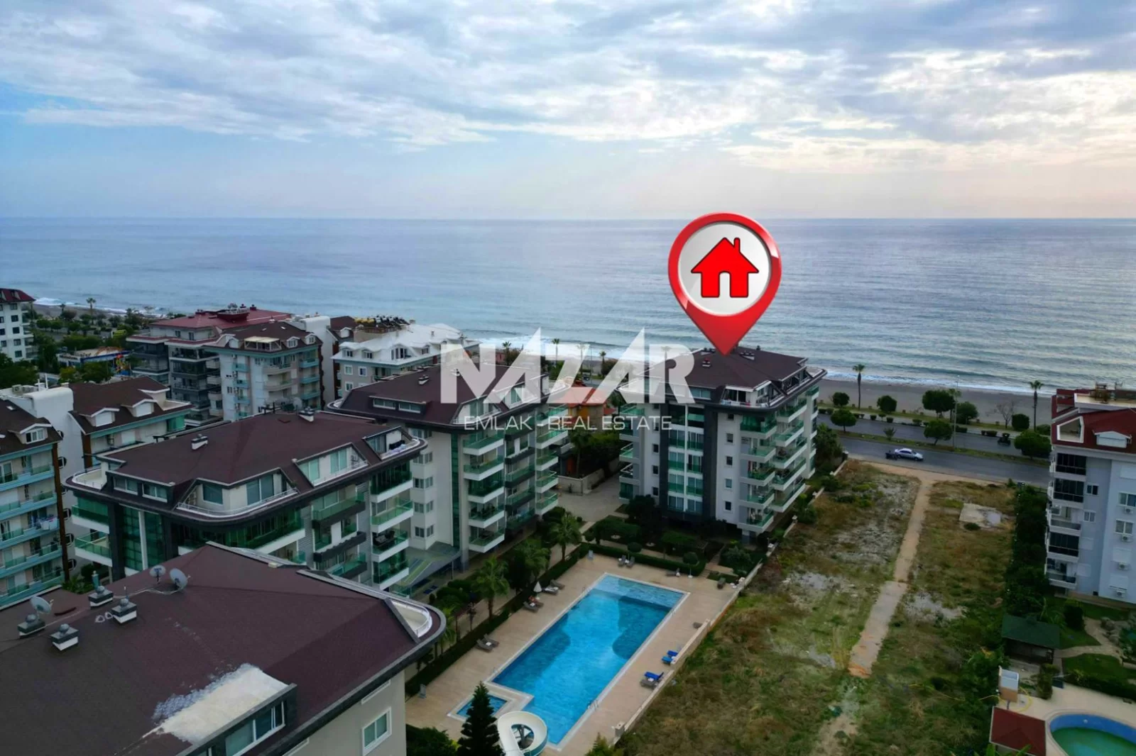 The site offers numerous amenities, including an outdoor and indoor swimming pool, car park, Turkish bath, sauna, gym, basketball court, 24/7 security, children's play area, barbecue area, and a well-maintained garden. You can access this special flat, located just 50 metres from the sea, through Nazar Emlak.
