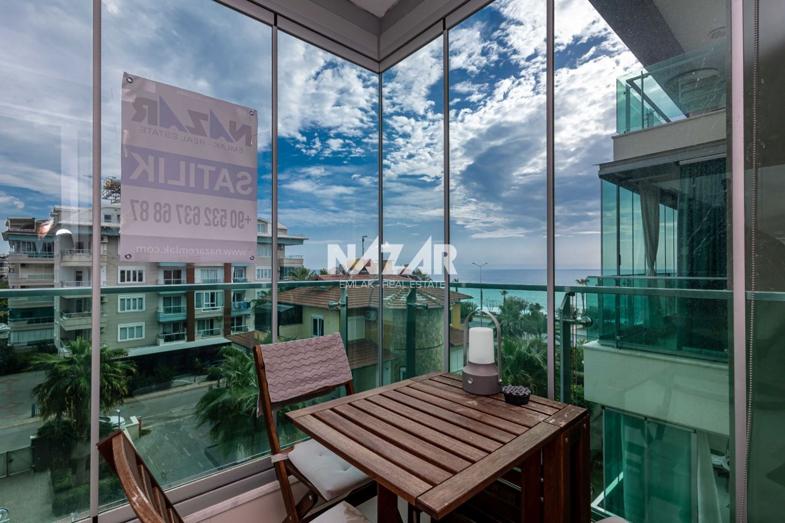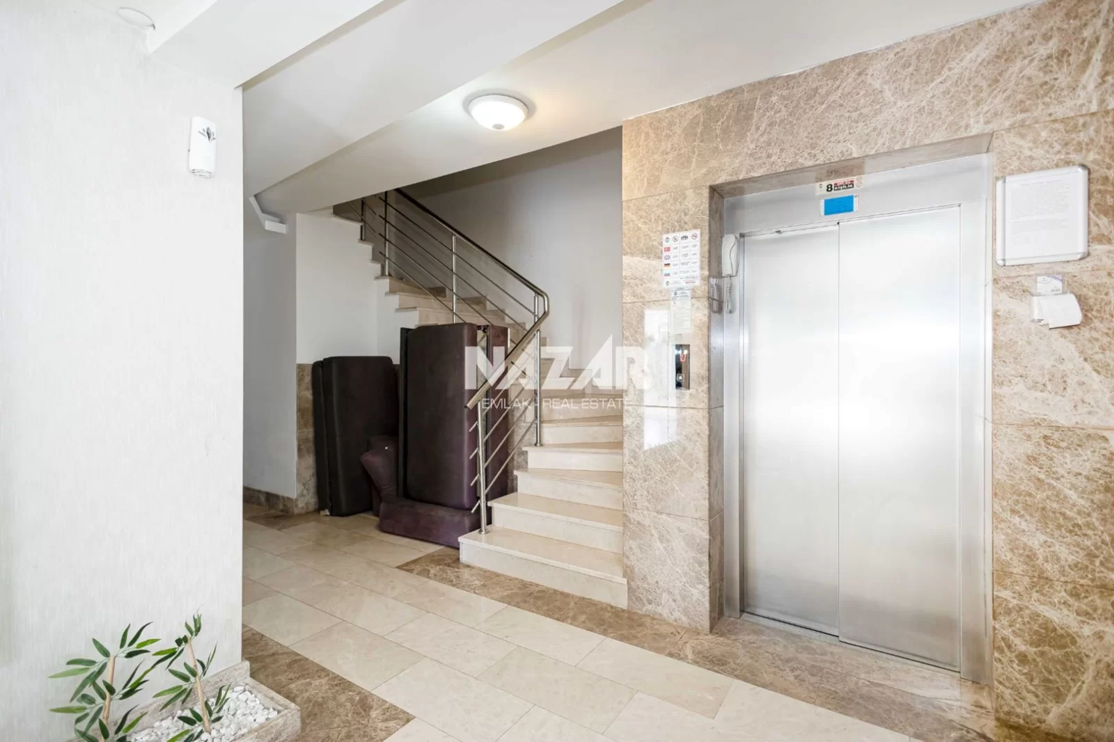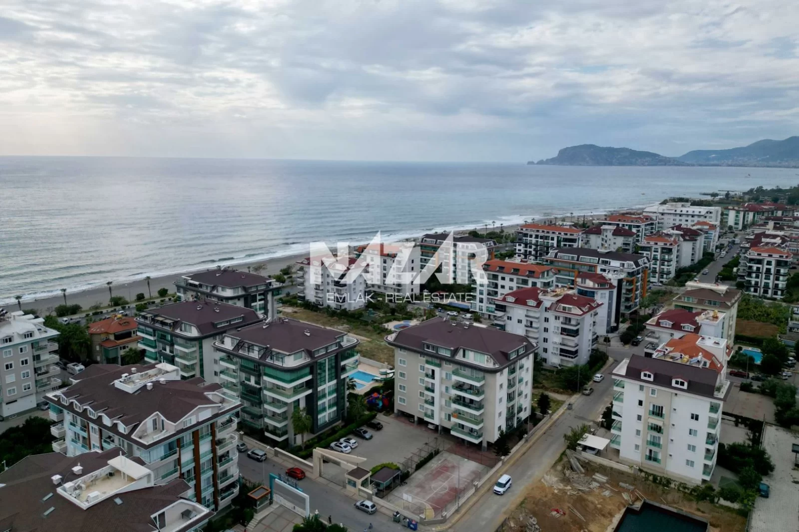 The site offers numerous amenities, including an outdoor and indoor swimming pool, car park, Turkish bath, sauna, gym, basketball court, 24/7 security, children's play area, barbecue area, and a well-maintained garden. You can access this special flat, located just 50 metres from the sea, through Nazar Emlak.