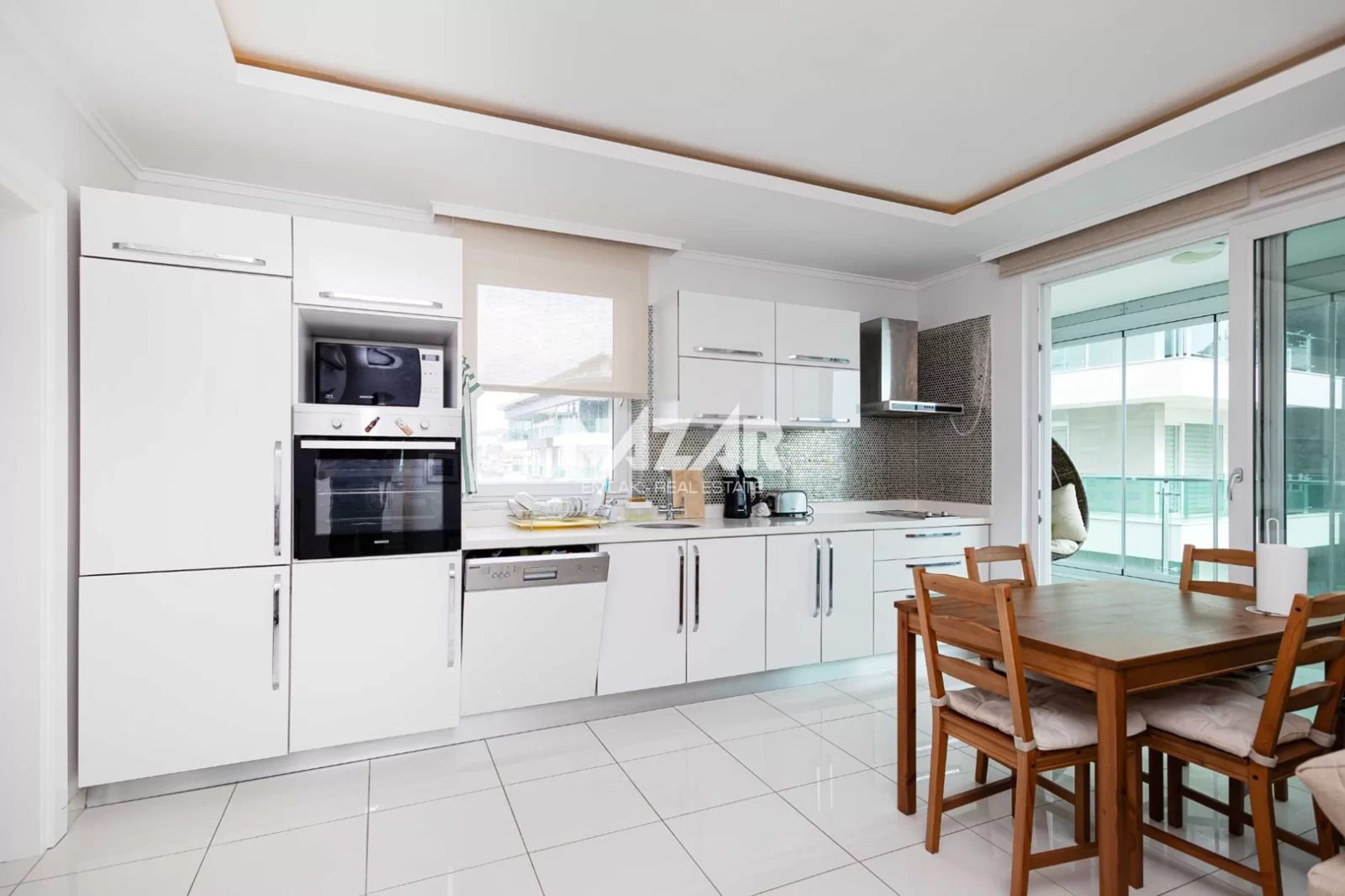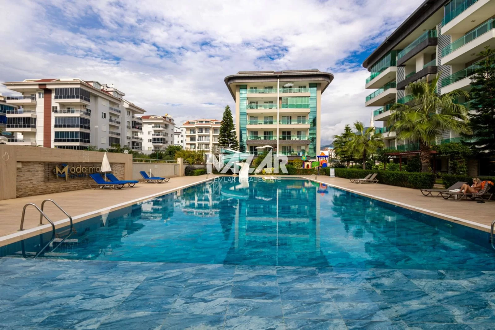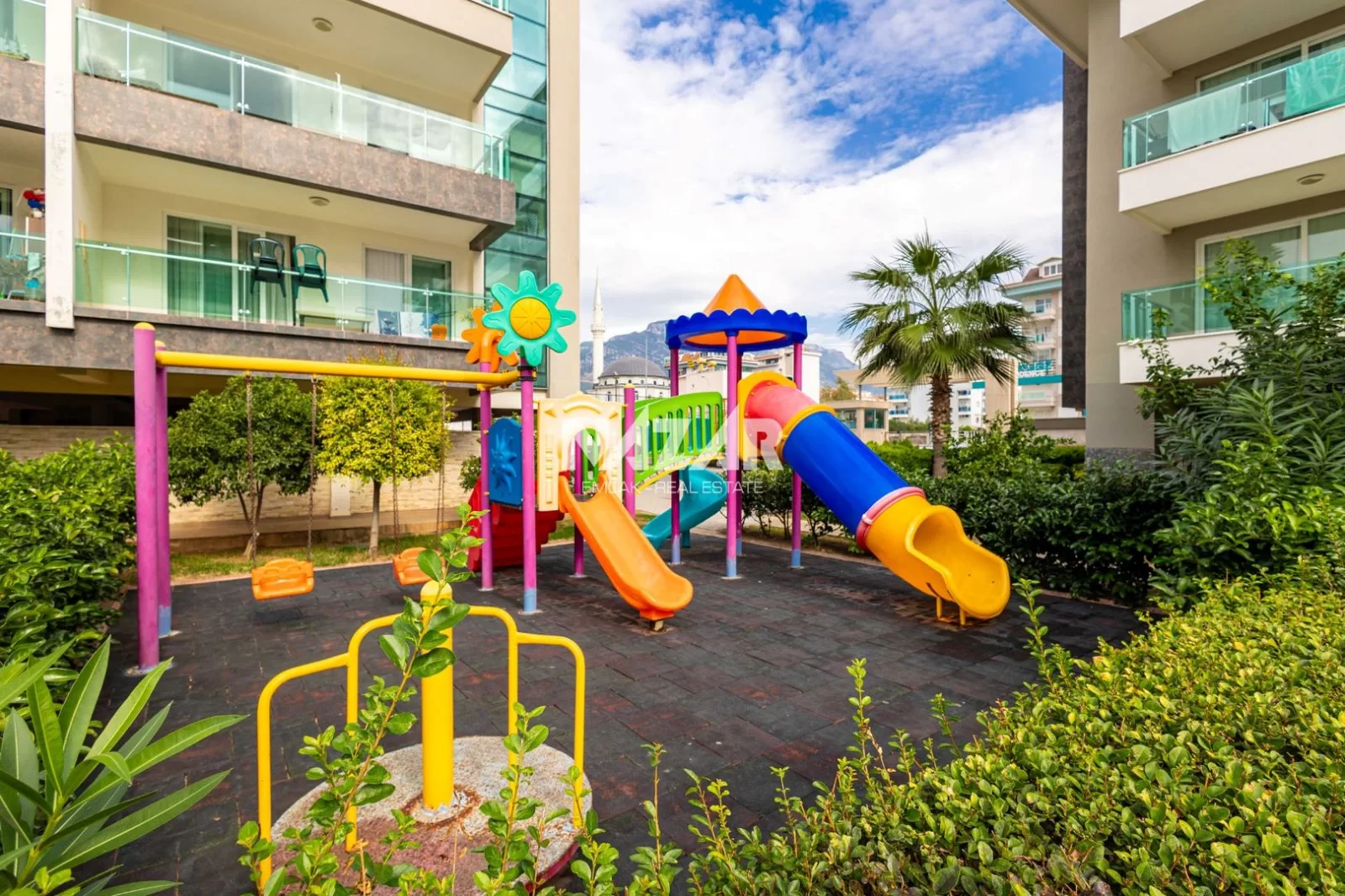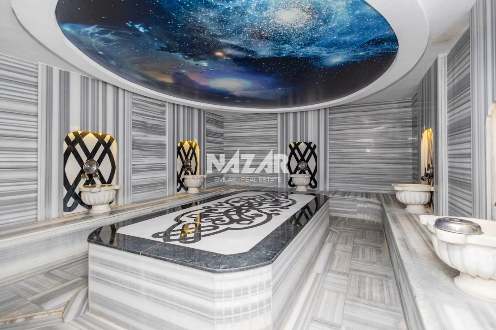 The site offers numerous amenities, including an outdoor and indoor swimming pool, car park, Turkish bath, sauna, gym, basketball court, 24/7 security, children's play area, barbecue area, and a well-maintained garden. You can access this special flat, located just 50 metres from the sea, through Nazar Emlak.