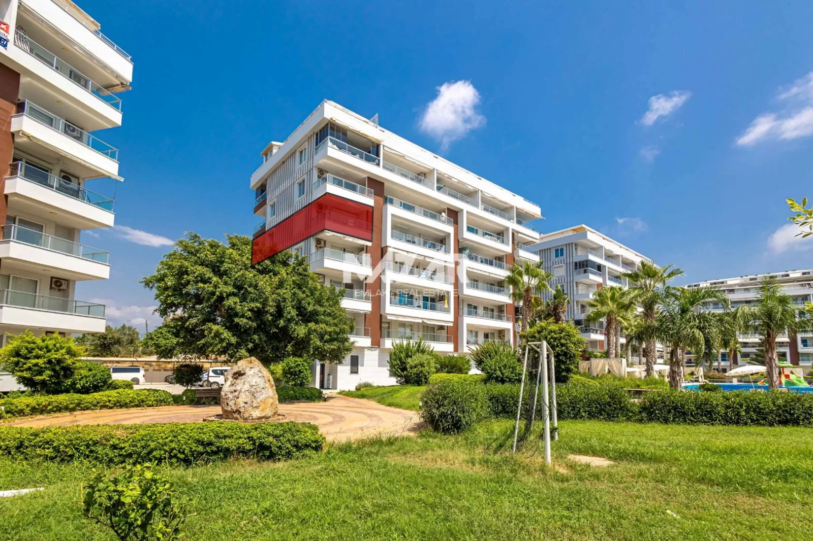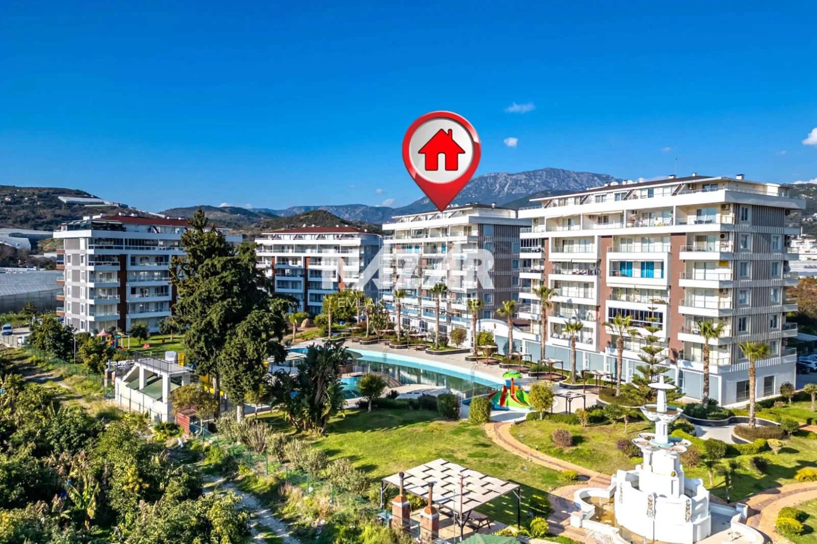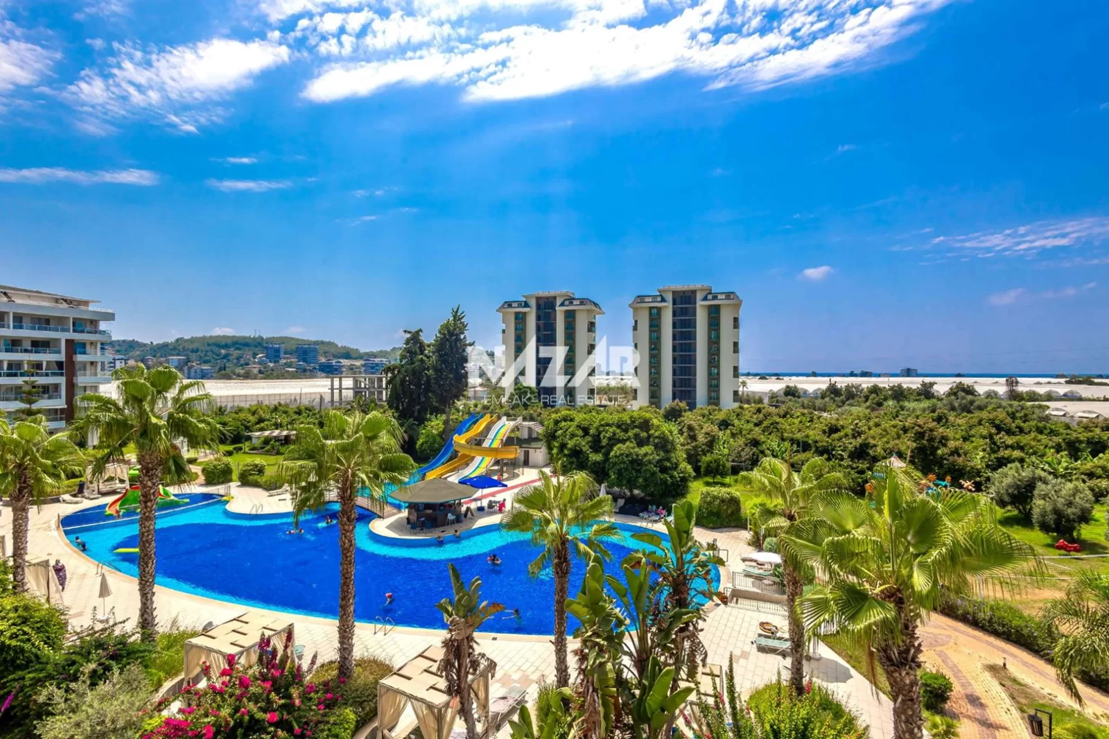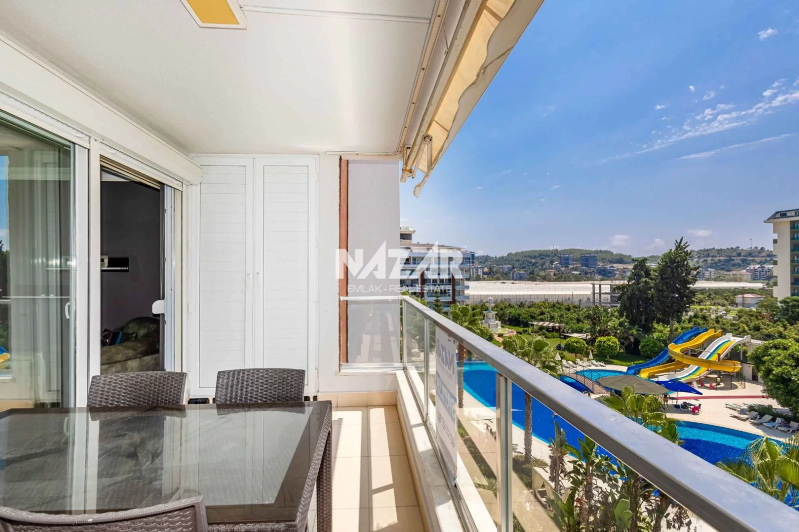 The site offers numerous social amenities, including indoor and outdoor swimming pools, a Turkish bath, sauna, gym, aquapark, children's playground, walking paths, barbecue areas, security, parking, and free WiFi. You can access this apartment, which offers a peaceful and comfortable lifestyle, through Nazar Emlak.