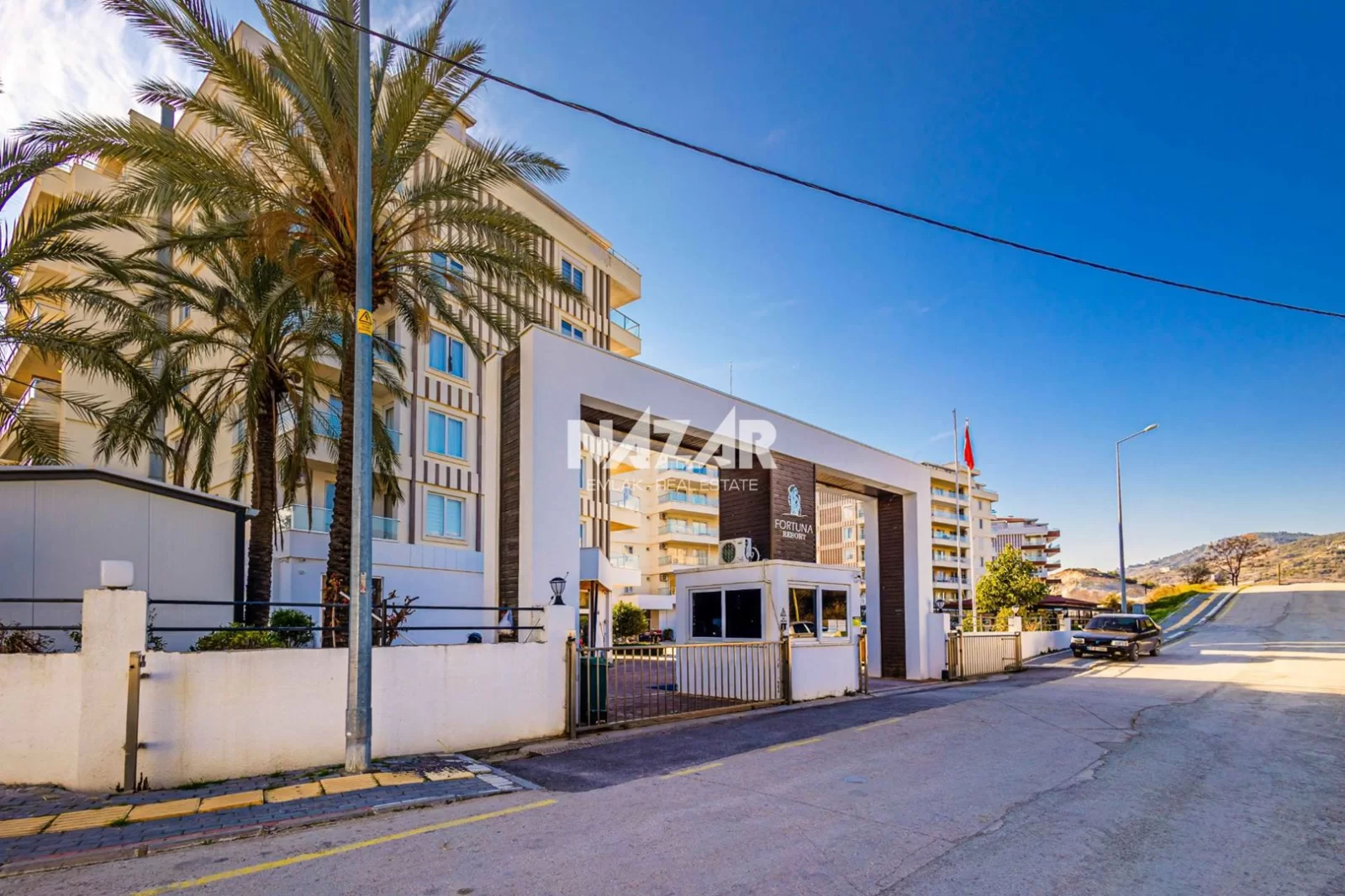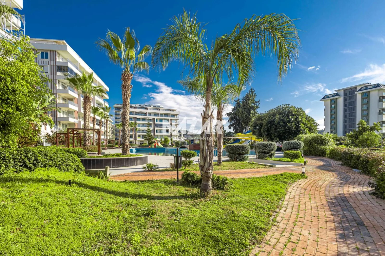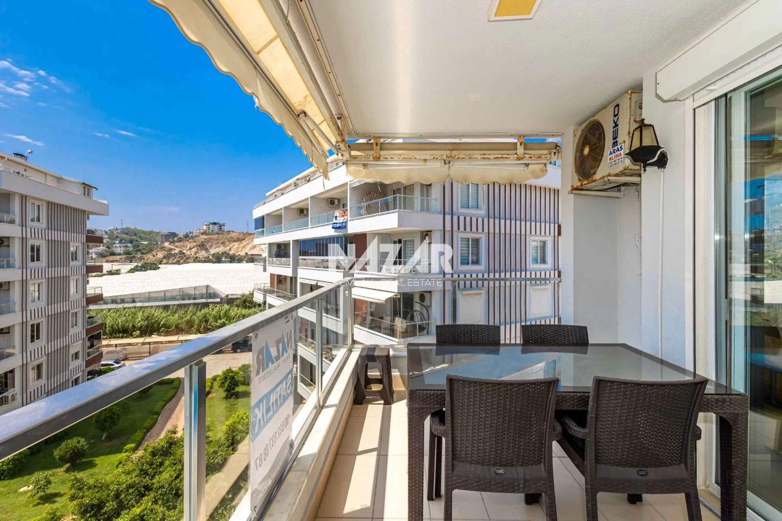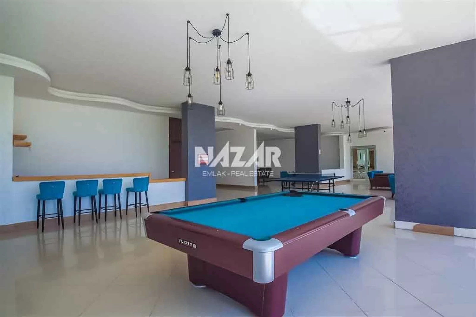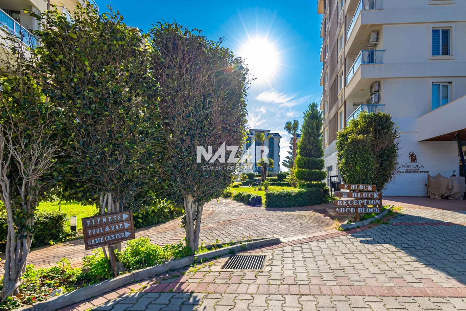 The site offers numerous social amenities, including indoor and outdoor swimming pools, a Turkish bath, sauna, gym, aquapark, children's playground, walking paths, barbecue areas, security, parking, and free WiFi. You can access this apartment, which offers a peaceful and comfortable lifestyle, through Nazar Emlak.